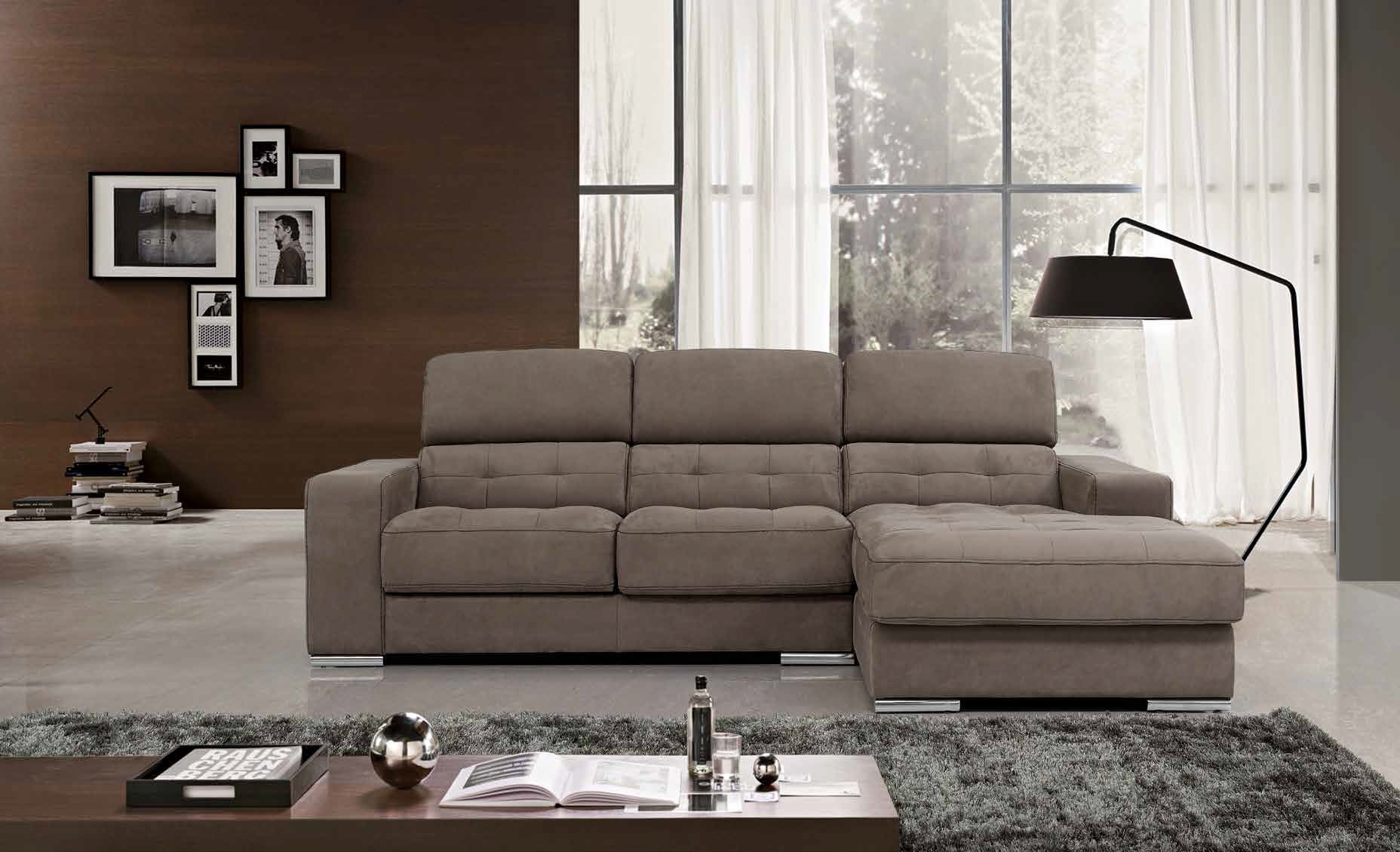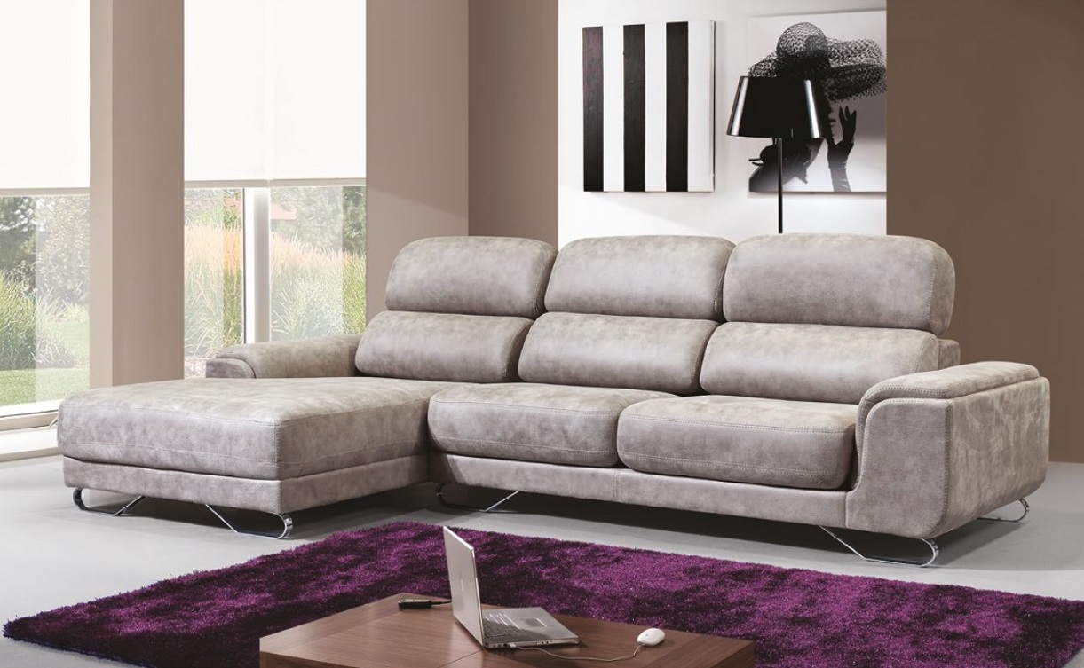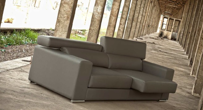 Sofá Chaiseloungue com costas reclináveis e assentos deslizantes estofado em microfibra. Cada modelo tem várias medidas e revestimentos (tecidos e peles) possíveis.