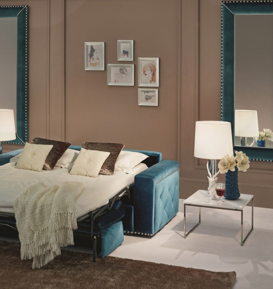Sofá Cama aberto. Cada modelo tem várias medidas e revestimentos (tecidos e peles) possíveis.