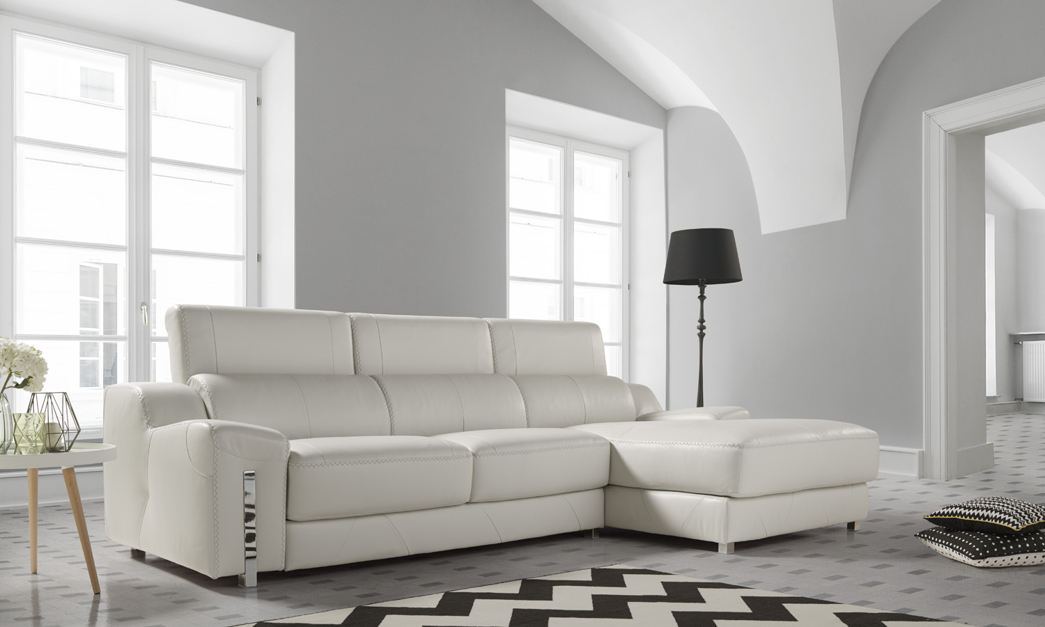 Sofá Chaiseloungue com assentos deslizantes. Cada modelo tem várias medidas e revestimentos (tecidos e peles) possíveis.