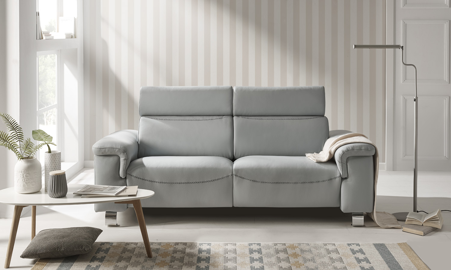 Sofá de 3L com assentos delizantes e costas reclináveis. Cada modelo tem várias medidas e revestimentos (tecidos e peles) possíveis.