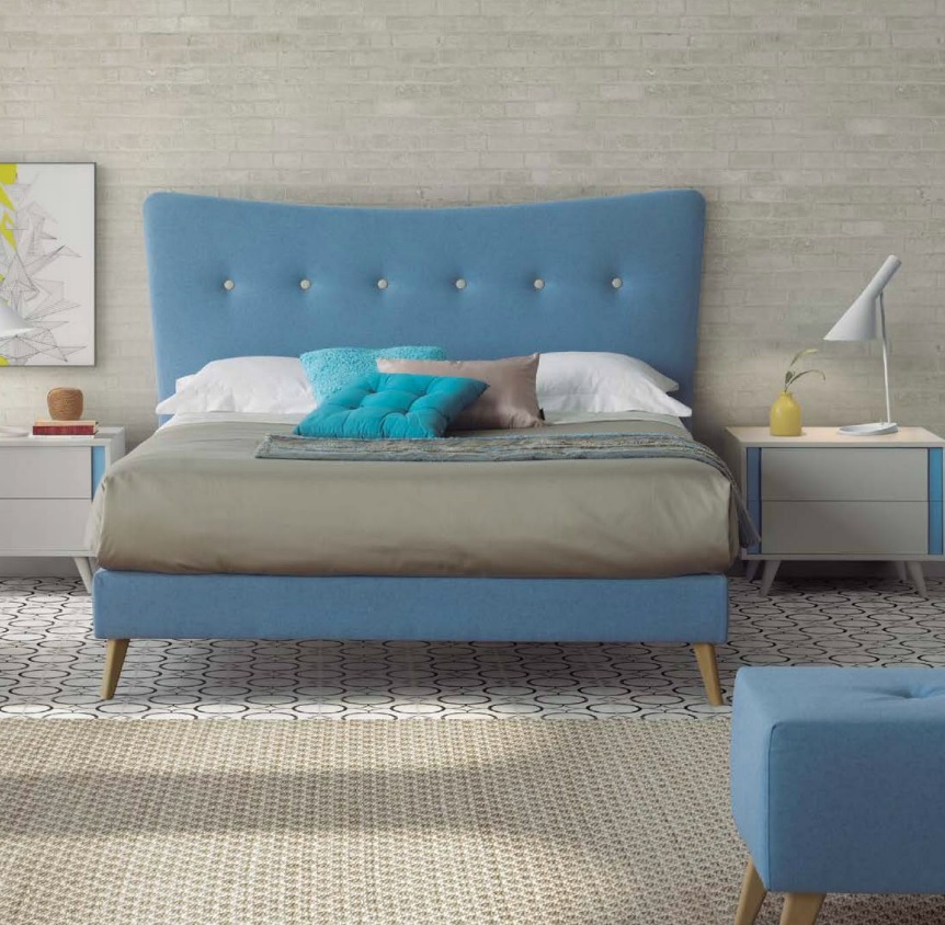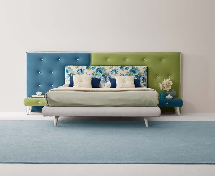 Cama com cabeceira com diferentes tecidos com aplicação de botões estofados.Fabricamos camas estofadas por medida.