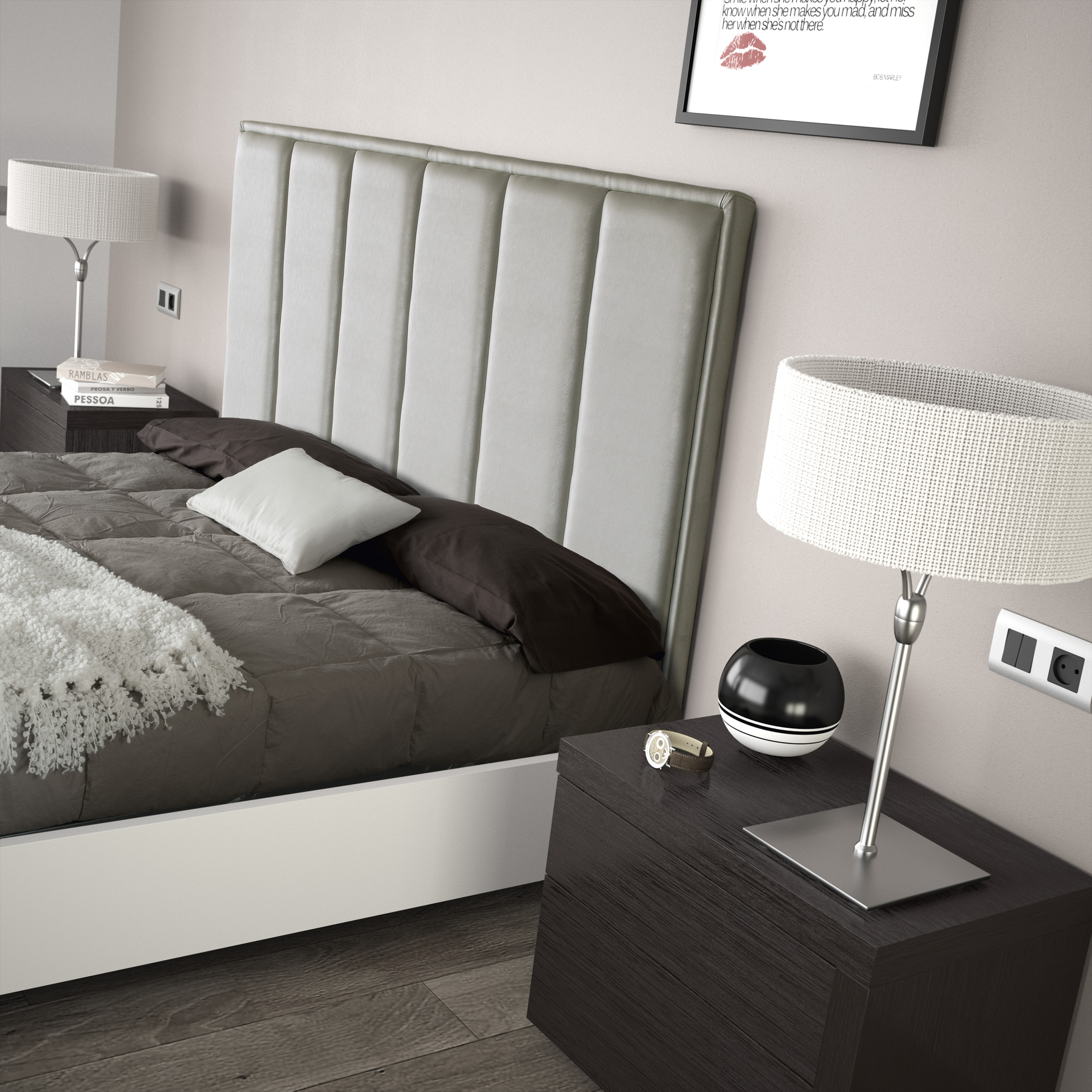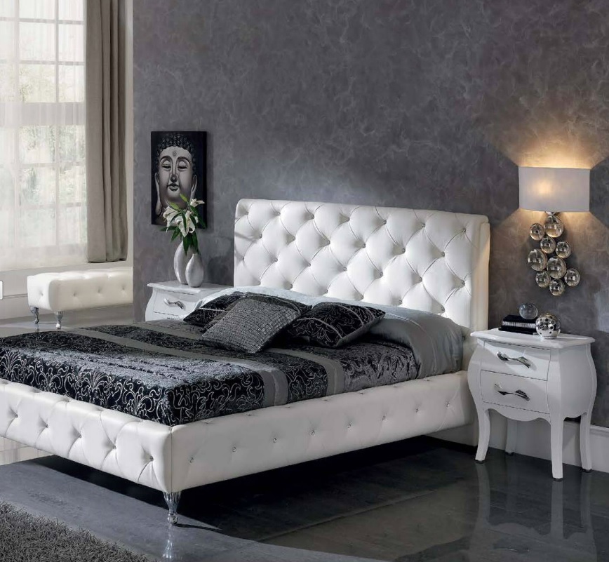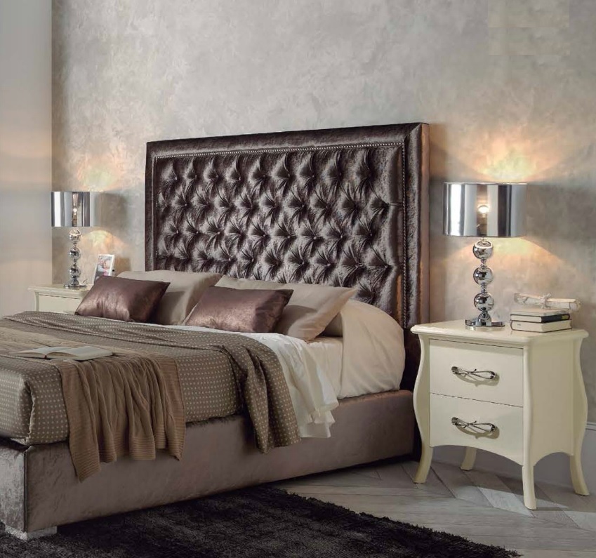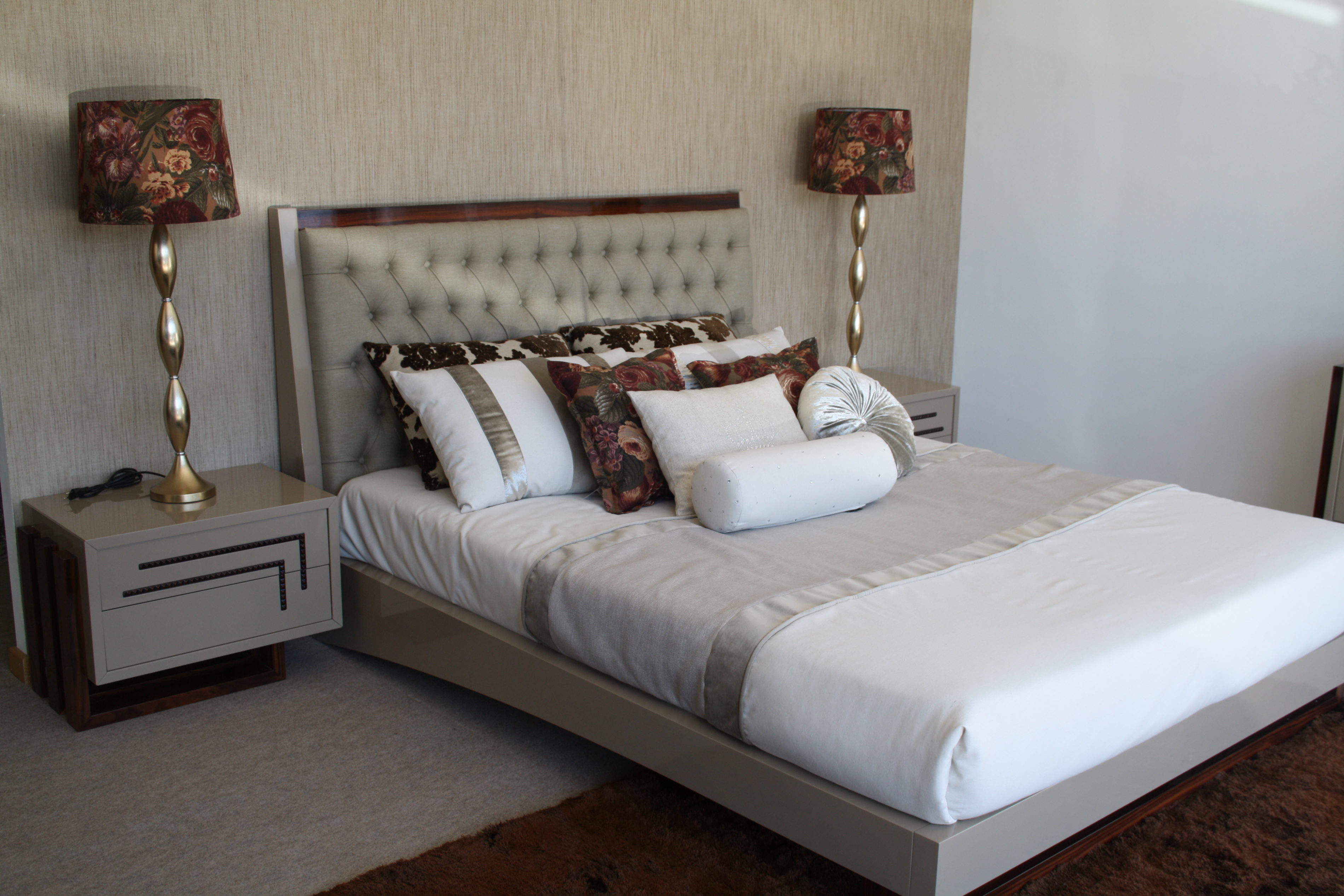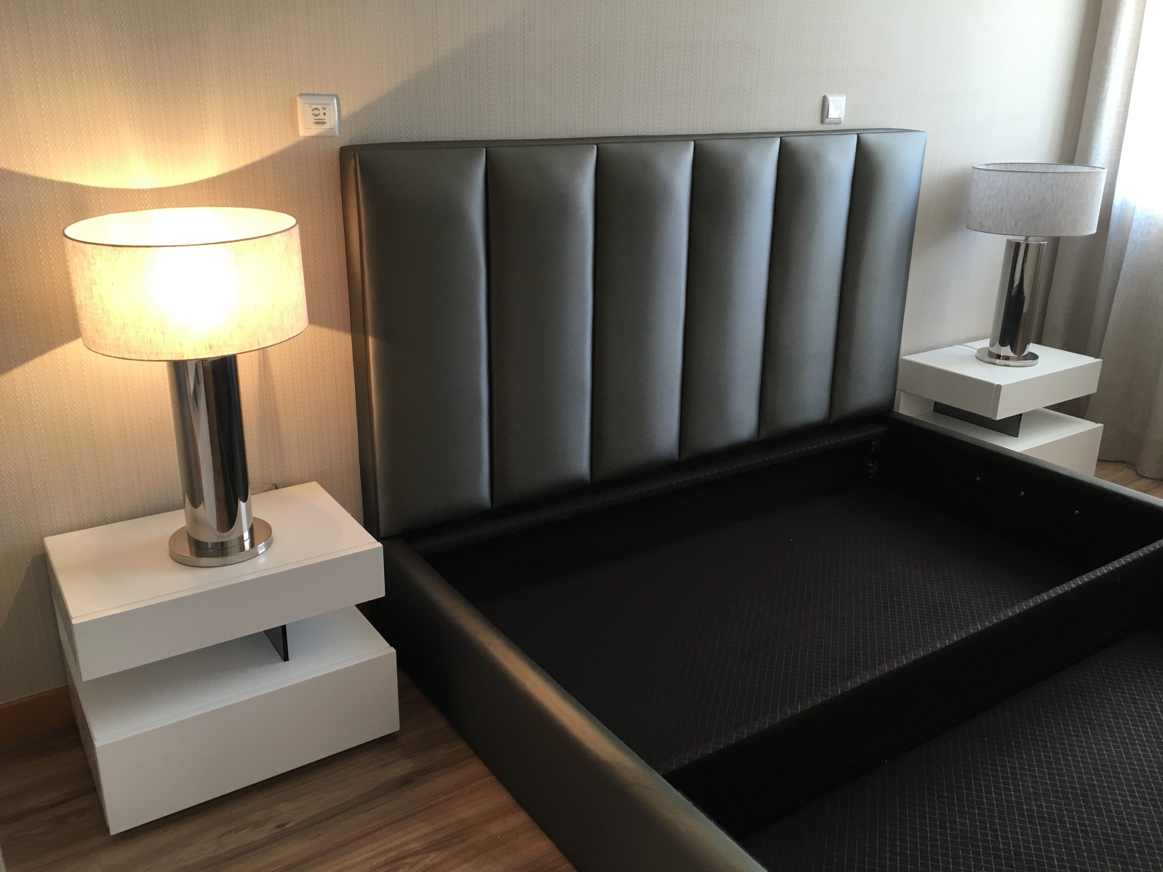 Cama com cabeceira estofada a Capitonê com estrutura em madeira e lacado alto brilho. Fabricamos camas por medida.