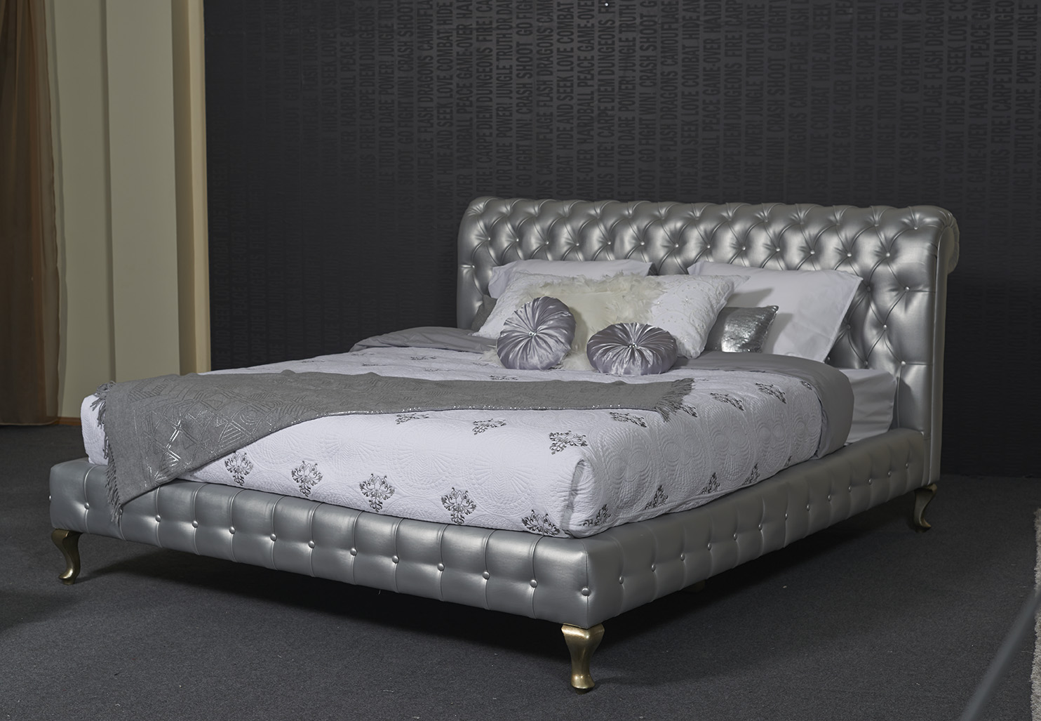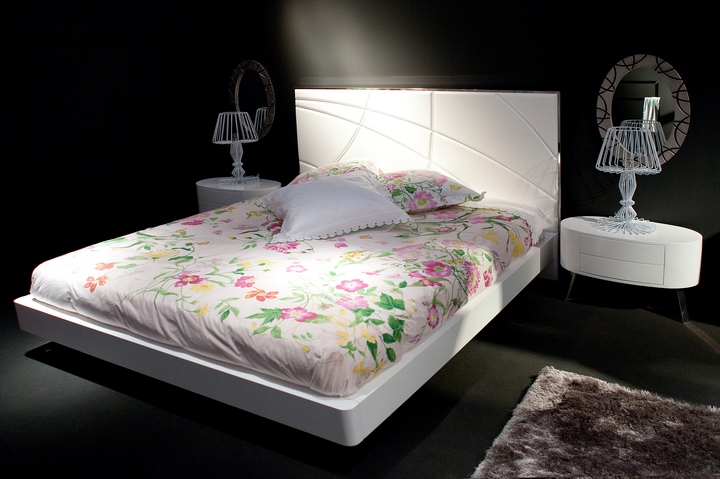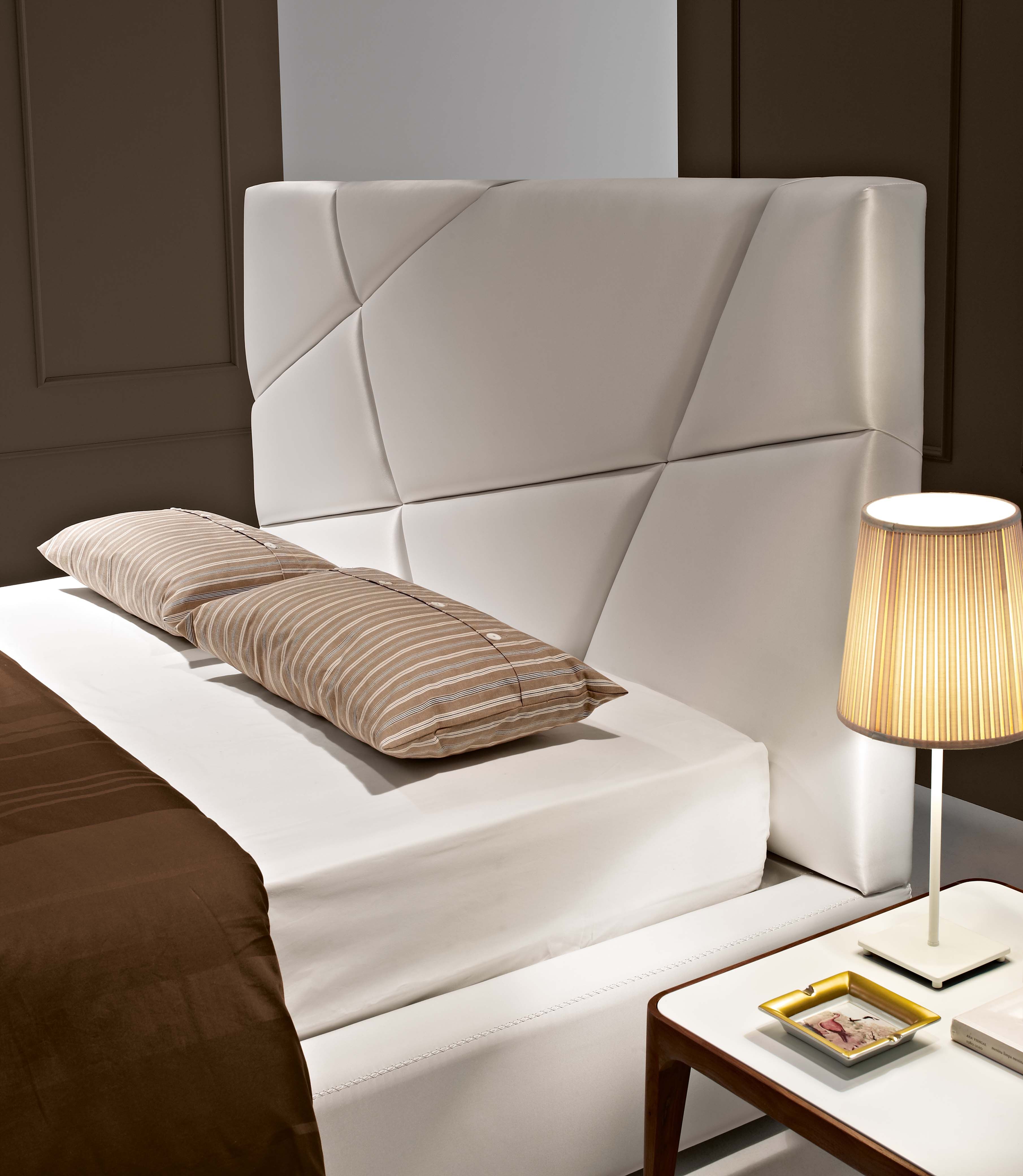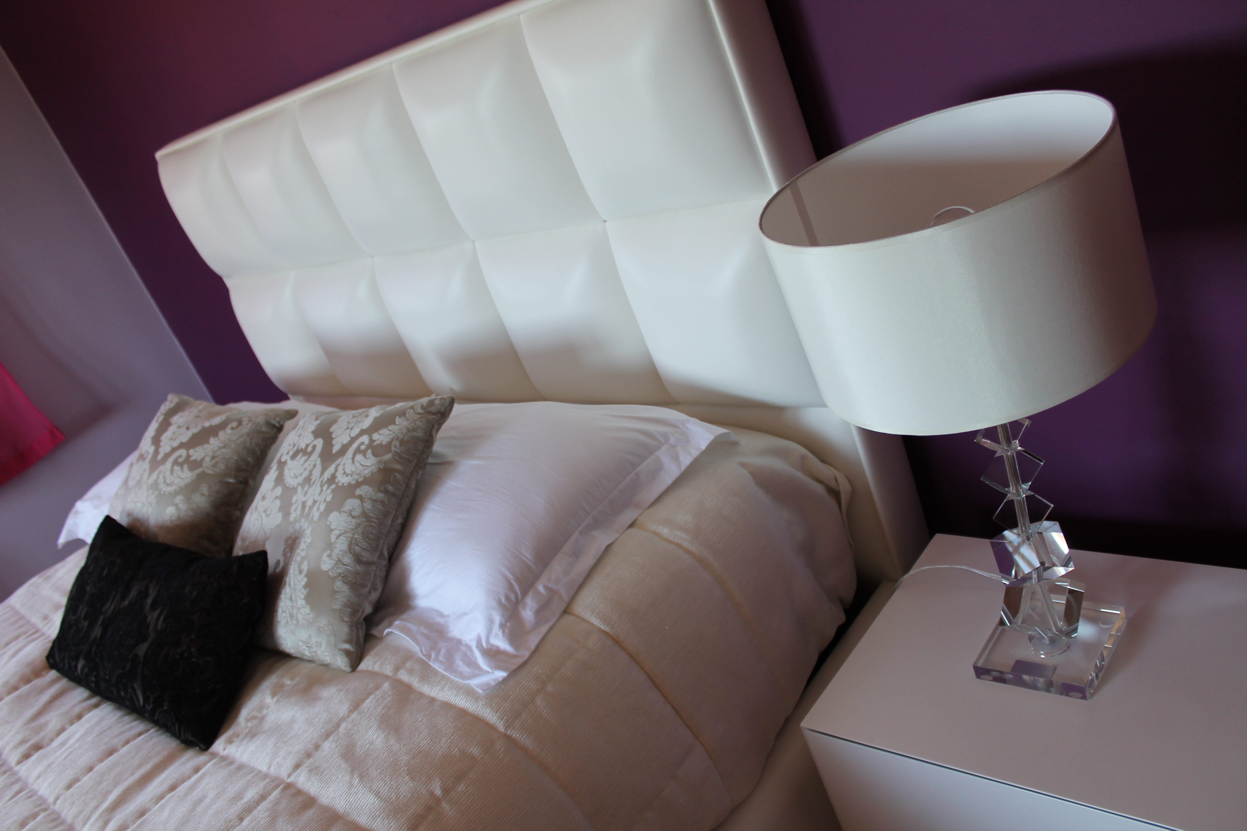 Cama com cabeceira estofada a Capitonê com estrutura em madeira e lacado alto brilho. Fabricamos camas por medida.