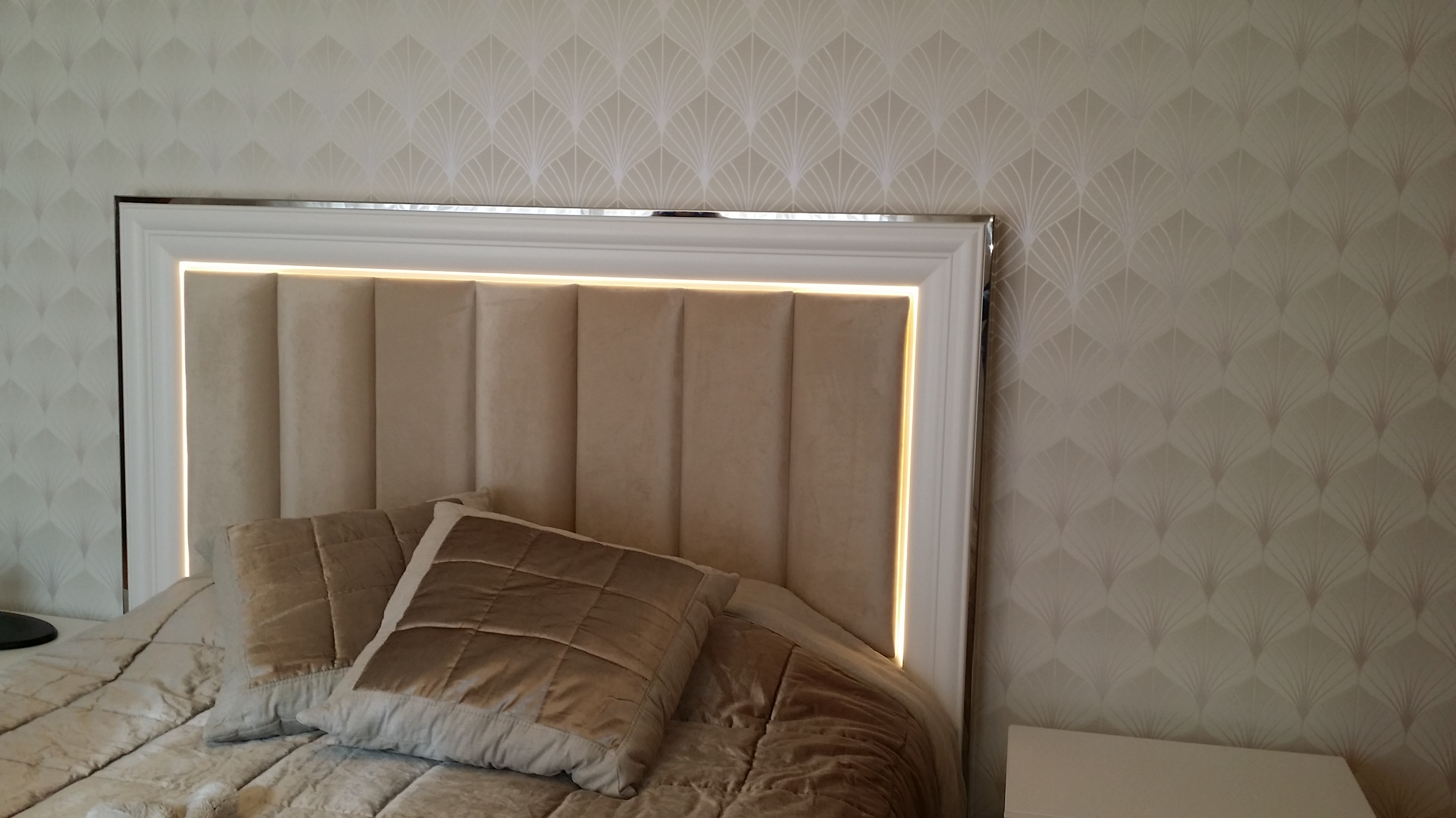 Cabeceira estofada às barras verticais com Leds e moldura a toda a volta em lacado alto brilho branco e inox. Fabricamos cabeceiras de cama por medida.